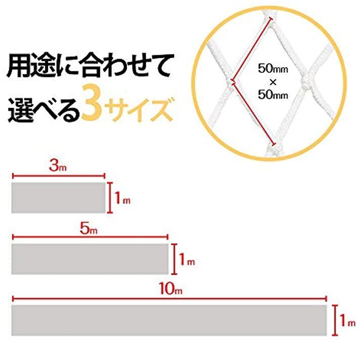 「ネットサイズ」」約1mx2m or 約1mx3m or 約1mx5m or 約1mx8m 「紐の直径(太さ)」約6mm 「素材」ポリエステル繊維 「穴のサイズ」60mmx60mm *モニターの環境により、色の見え方に若干差が生じる場合がございます。