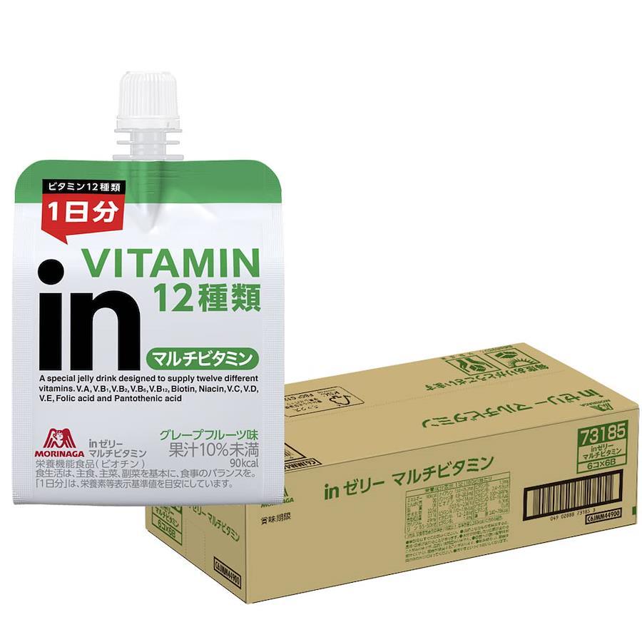 【1日分のビタミン10秒チャージ】「inゼリー」シリーズはおいしく素早く目的のエネルギーや栄養素・水分を補給できる、飲むゼリータイプの栄養補助食品です。●1日分のビタミン12種類を配合1個90kcalで1日分のビタミンが補えます。ビタミンは食事内容によっては不足しやすい栄養素のため、食事バランスが気になる日に適しています。●フレーバーすっきり飲めるグレープフルーツ味。小腹満たしになるので、スポーツ現場だけでなく、普段の生活での間食にも適しています。●飲用シーン(例):・小腹満たし、食事代わり、おやつに・食欲がないとき、予防に・野菜が苦手、外食が多い、生活が不規則など栄養バランスが偏りがちな方に・お肌のメンテナンス・美容に・いざというときの非常食に、ストックに 特徴: 【1日分のビタミンを10秒チャージ】 日々のコンディショニングに、1袋にビタミン12種類が入った栄養補給のためのゼリー飲料。栄養機能食品(ビオチン)。 配合栄養素: ビタミンA、ビタミンB1、ビタミンB2、ビタミンB6、ビタミンB12、ビオチン、ナイアシン、ビタミンC、ビタミンD、ビタミンE、葉酸、パントテン酸 味: グレープフルーツ味 (Grapefruit-flavored jelly drink) カロリー: 1個当たり 90kcal 内容量: 36個(6個入×6箱)