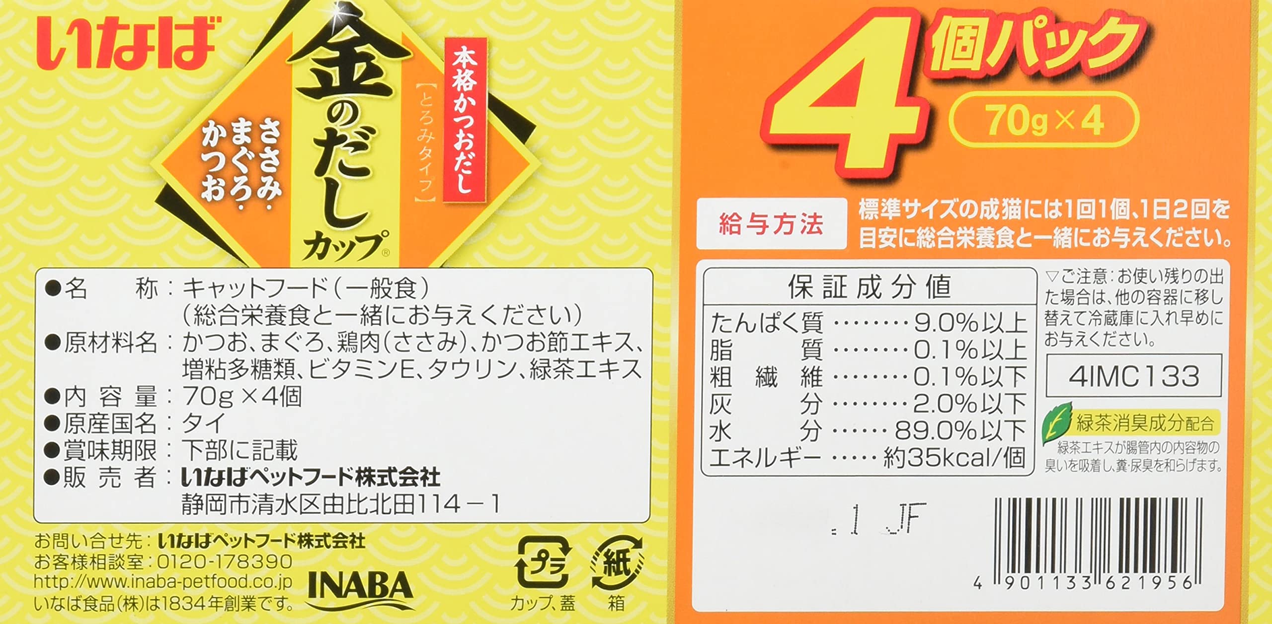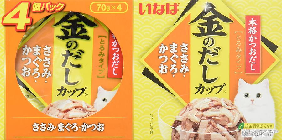かつお、まぐろ、鶏肉(ささみ)、かつお節エキス、増粘多糖類、ビタミンE、タウリン、緑茶エキス