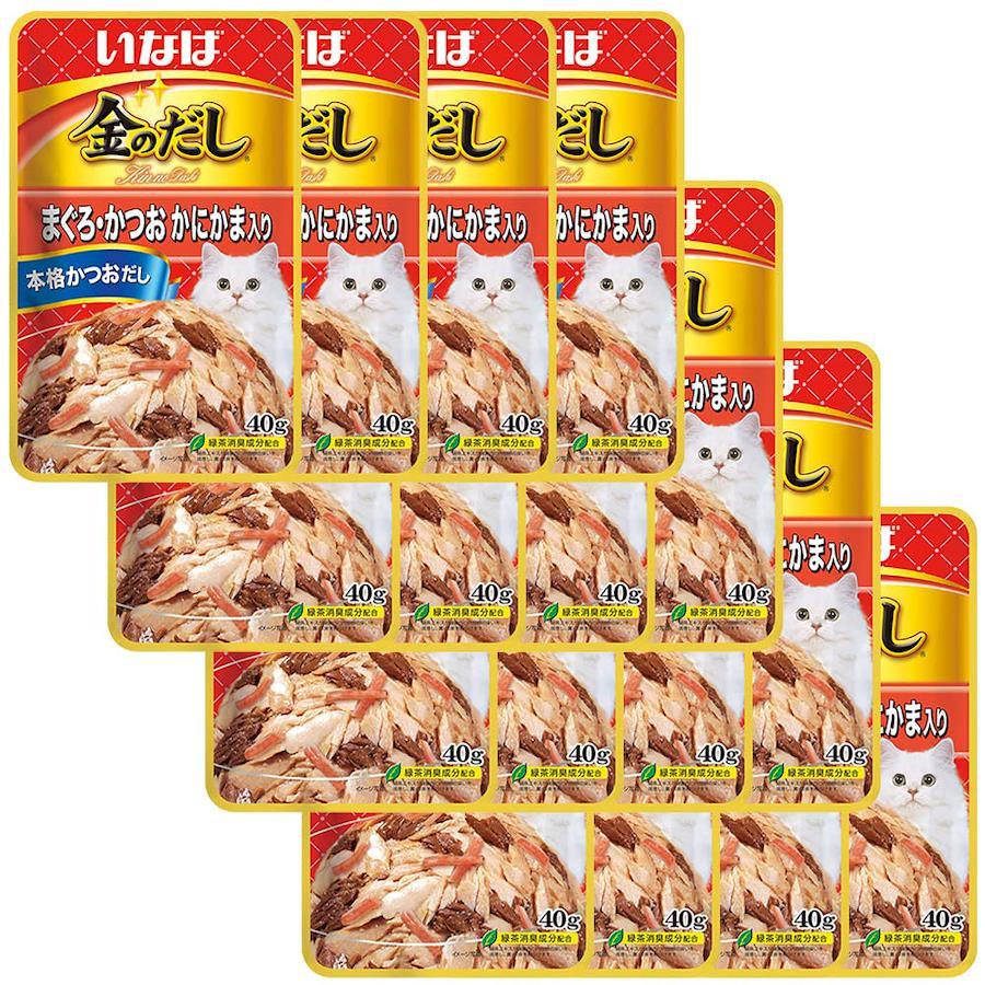【原材料】 かつお、まぐろ、かに風味かまぼこ、酵母エキス、かつお節エキス、昆布エキス、増粘多糖類、ビタミンE、緑茶エキス 【保証成分】 たんぱく質10.0%以上、脂質0.2%以上、粗繊維0.1%以下、灰分2.0%以下、水分87.0%以下 【エネルギー】 約23kcal/袋