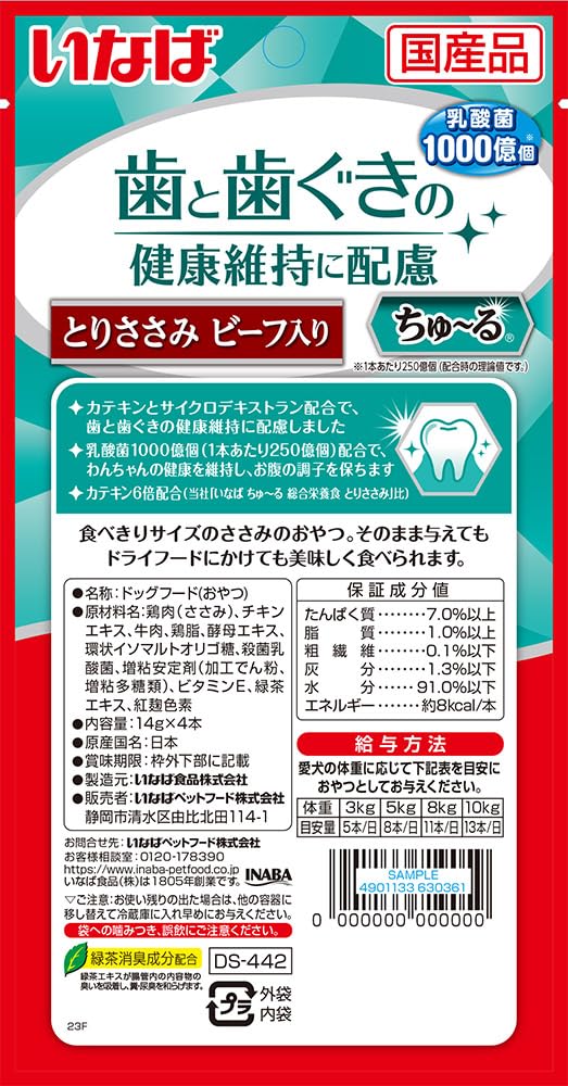 ・食べきりサイズのささみのおやつです。そのまま与えてもドライフードにかけても美味しく食べられます。 ・カテキンとサイクロデキストラン配合で、歯と歯ぐきの健康維持に配慮しました。 ・乳酸菌1000億個(1本あたり250億個)配合で、わんちゃんの健康を維持し、お腹の調子を保ちます。 ・カテキン6倍配合(いなばちゅ~る 総合栄養食 とりささみ 比) ・緑茶消臭成分配合(緑茶エキスが腸管内の内容物のニオイを吸着し、糞・尿臭を和らげます。)