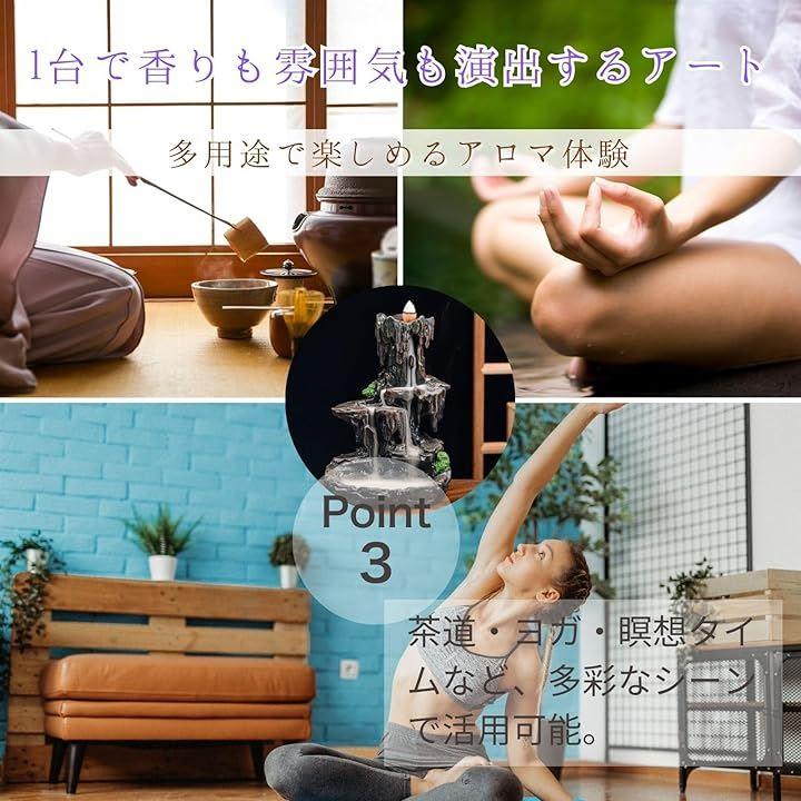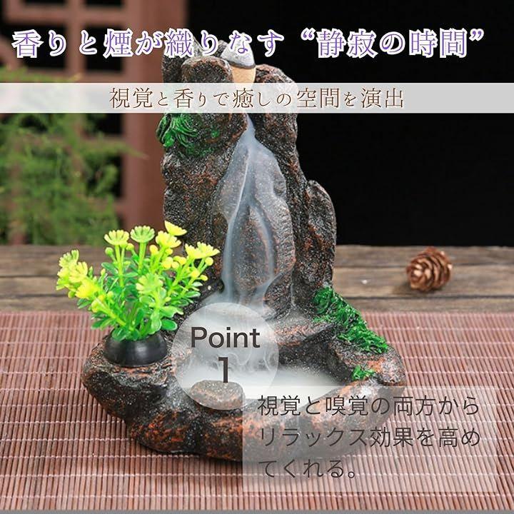 「視覚と香りで癒しの空間を演出」逆流する煙が滝のように流れ落ちる視覚効果で、心が落ち着く癒しのひとときに。