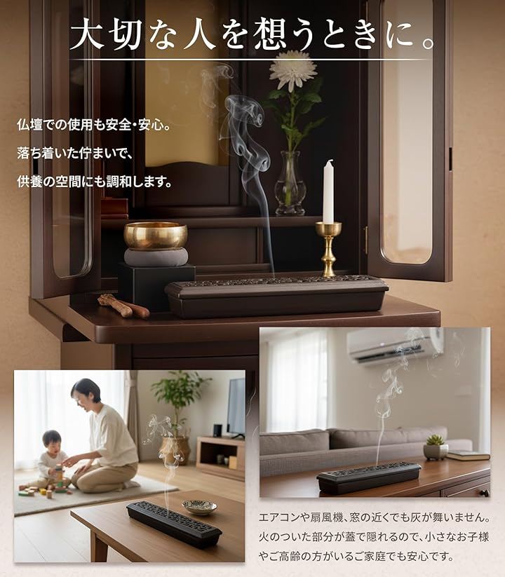 「灰がこぼれないから掃除がラク・清潔に使える」お香の灰はすべて灰受けに落ちるので、机・棚・床が汚れず常に清潔&安全。