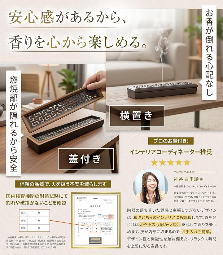 「灰がこぼれないから掃除がラク・清潔に使える」お香の灰はすべて灰受けに落ちるので、机・棚・床が汚れず常に清潔&安全。