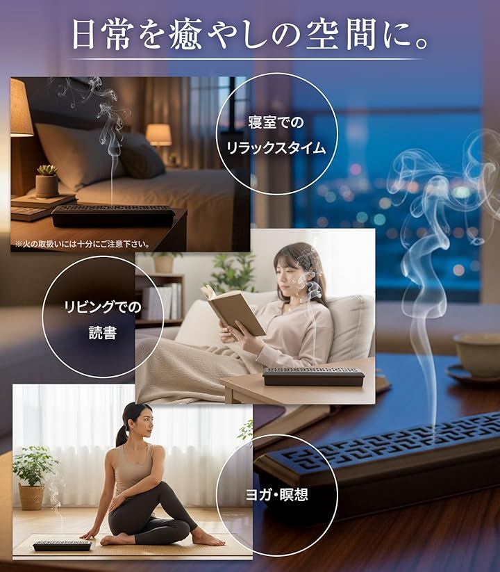 仕事や家事の合間、リビングでの読書、就寝前のリラックス、ヨガや瞑想の集中タイムなど、さまざまなシーンで使用できます。