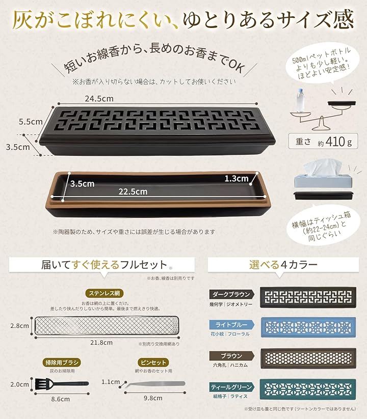 「灰がこぼれないから掃除がラク・清潔に使える」お香の灰はすべて灰受けに落ちるので、机・棚・床が汚れず常に清潔&安全。