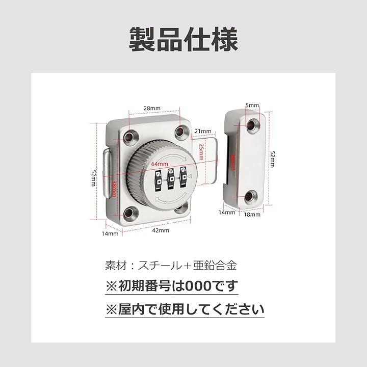 「製品仕様」「本体寸法」縦52mm 横42mm ボルト幅64mm 「ボルト受け寸法」縦52mm 横18mm 「素材」亜鉛合金、スチール *屋内で使用してください