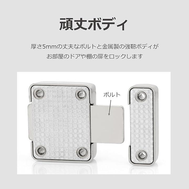 「頑丈ボディ」厚さ5mmの丈夫なボルトと金属製の強靭ボディがお部屋のドアや棚の扉をガッチリロックします