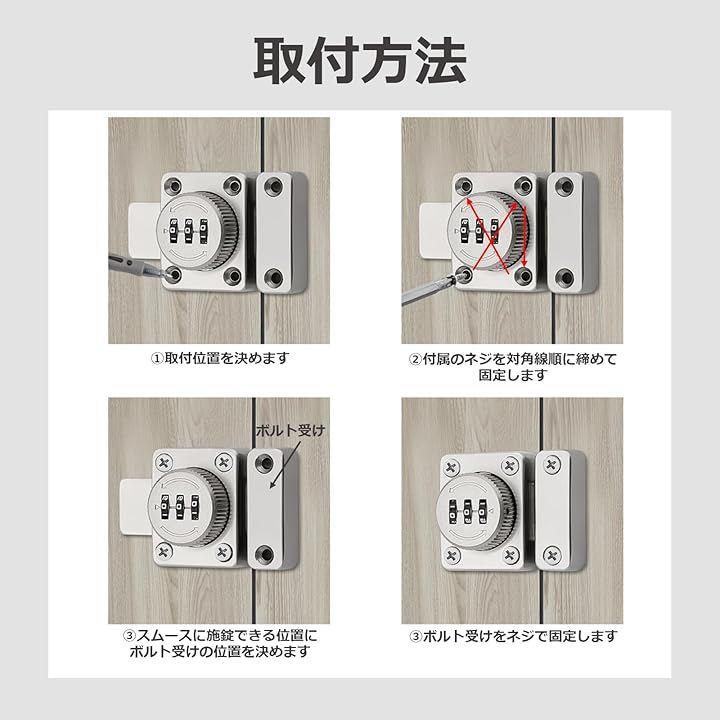 「取付方法」(1)取付位置を決めます (2)付属のネジを対角線順に締めて固定 (3)ボルト受けの位置を確認します (3)ボルト受けをネジで固定します