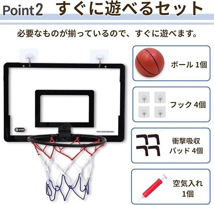 「充実のセット」バスケットゴール、ネット、ボール、空気入れ、粘着式壁掛けフックがセットになっています。