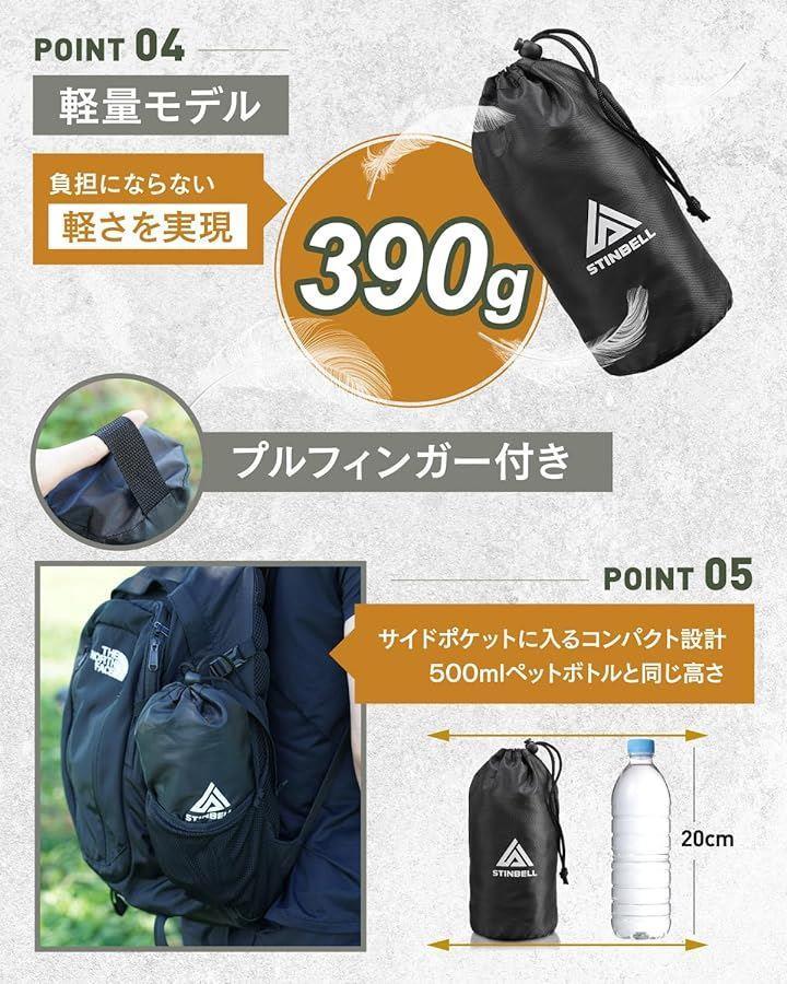 軽量モデル390g、収納時の高さはペットボトルと同じ20cmバッグのサイドポケットに入るコンパクト設計。