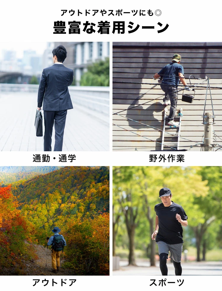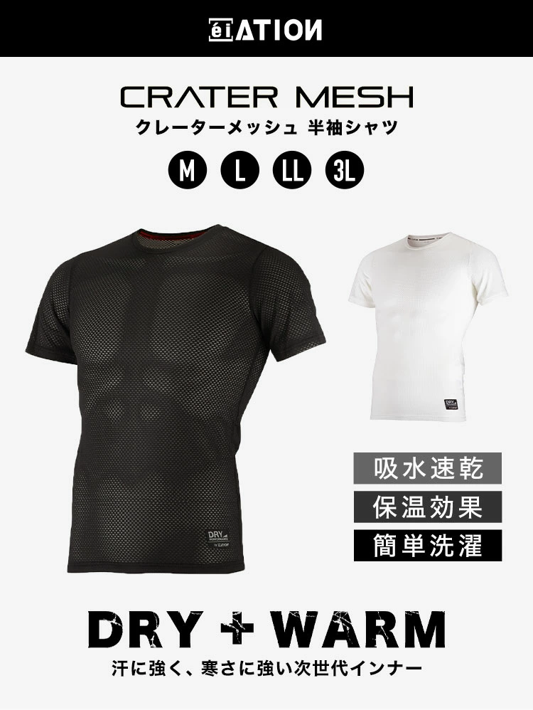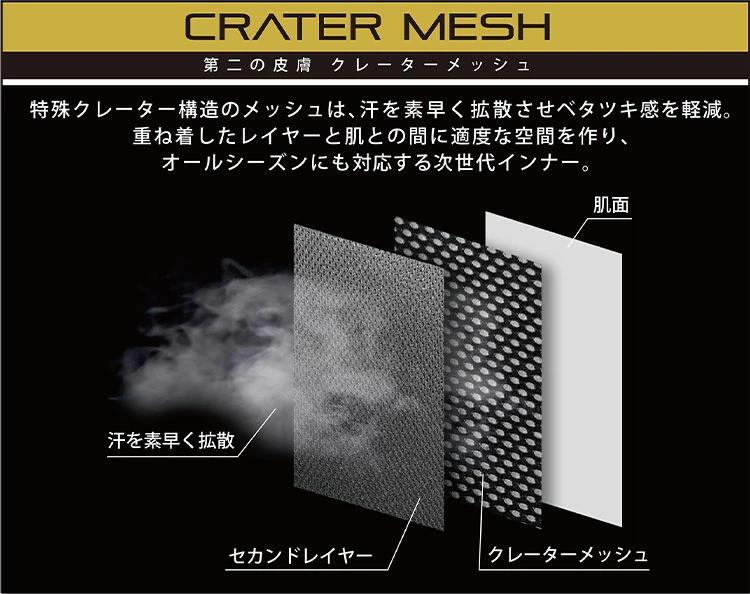 【クレーターメッシュクルーネック半袖】夏はサラサラ、冬はポカポカのオールシーズン着用可能な高機能インナー。通気性の良い特殊クレーター構造のメッシュが夏は汗を素早く拡散させベタツキ感を軽減、冬は凹部に空気が溜まり適度な温度を保つ保温効果を発揮してくれます。生地には伸縮性も備わっている為、動きやすく着用時のストレスを抑える事が可能です。通年通して着用可能なので通勤や通学、アウトドアにスポーツなど様々なシーンでオススメです。