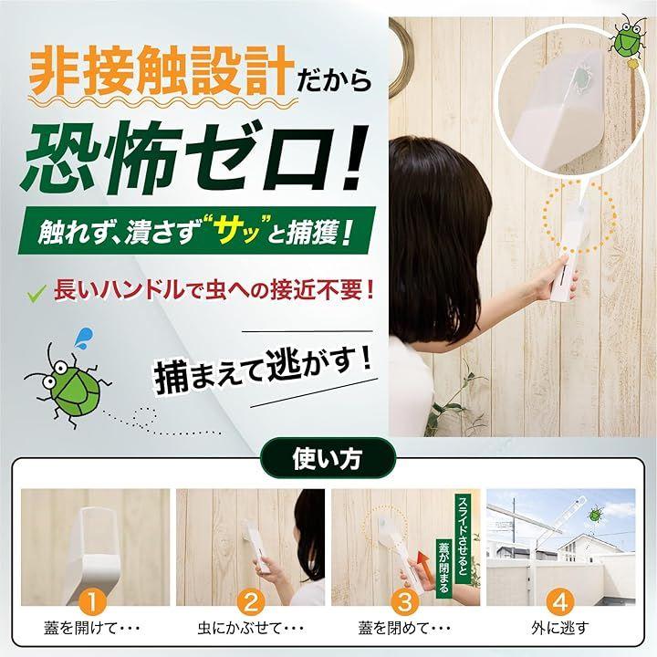簡単4ステップで誰でも使える (1)蓋を開ける>(2)虫にかぶせる>(3)蓋を閉める>(4)外に逃がす 触れず、潰さず「サッと捕獲」するだけ。
