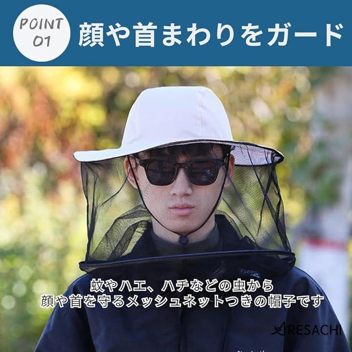 「顔や首まわりをガード」蚊やハエ、ハチなどの虫から顔や首を守るメッシュネットつきの帽子です。