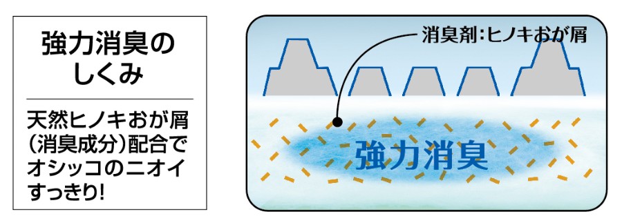 【材質】表面材:ポリエチレンメッシュシート吸水材:綿状パルプ、吸水紙、高分子吸収材防水材:ポリエチレンフィルム結合材:ホットメルト粘着材消臭剤:ヒノキ