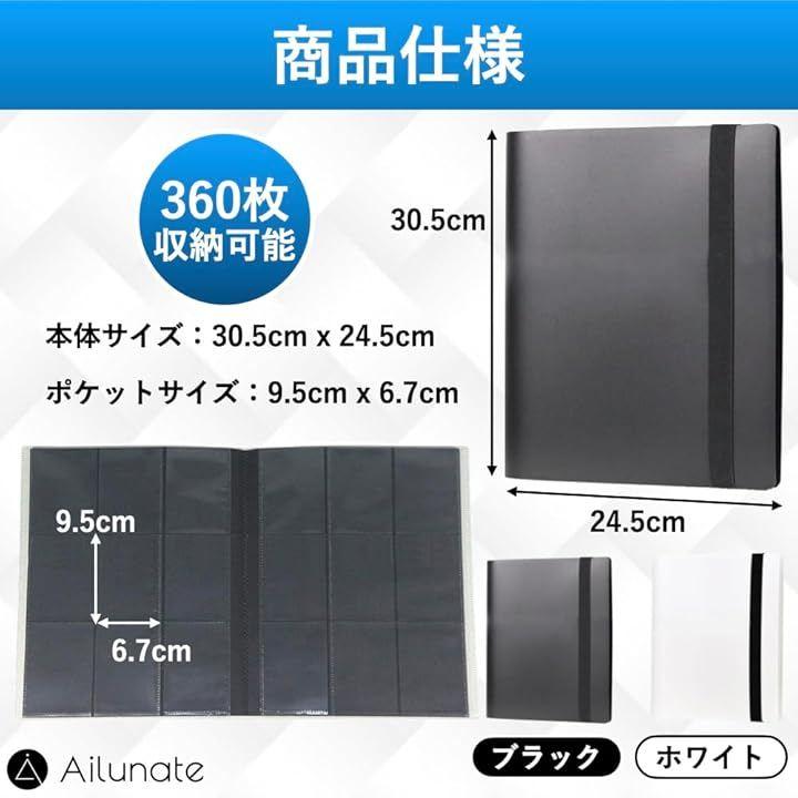 「商品仕様」本体サイズ:30.5cm x 24.5cm、ポケットサイズ:9.5cm、チェキ収納枚数:360枚、カラー:ブラック/ホワイト