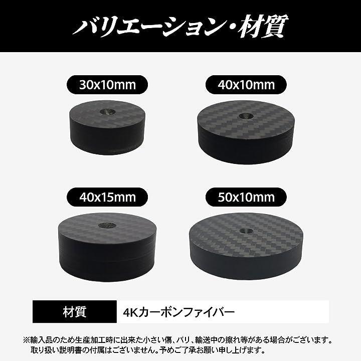 「商品詳細」サイズ:40x10mm|中央凹み:約φ5mm円錐形|素材:4Kカーボンファイバー|スパイク適応可能。
