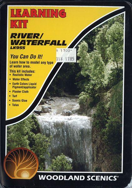 川と滝を造るのに必要な地面の色、水の素材、水の着色剤、石膏布、砂利、芝の素材、接着剤がセットになっています。