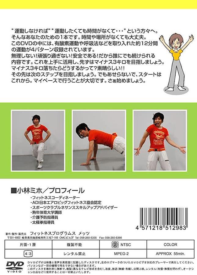 このDVDの中には、有酸素運動や呼吸法などを取り入れた約12分間の運動が4パターン収録されています。
