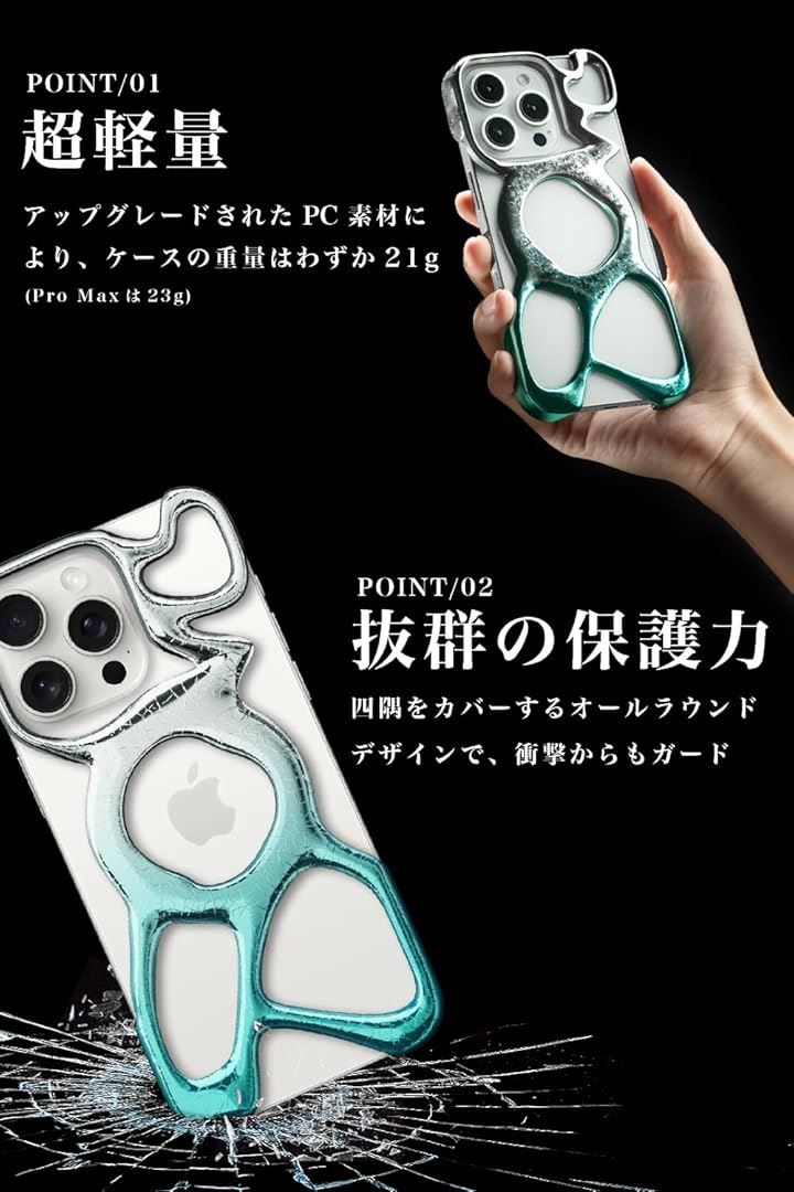 まるで液体金属がiPhoneを包み込むかのような、滑らかな曲線美が特徴です。