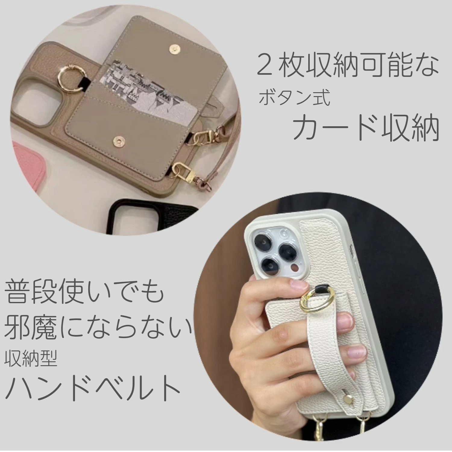 ショルダーストラップ・カード収納・ハンドベルトを備えた多機能iPhoneケース。
