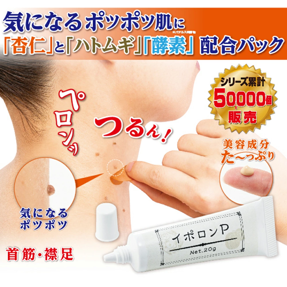 【商品名(JAN)】イポロンP 20g(4560164885548)【商品サイズ(約)】幅3.5×奥行2.1×長さ11.4cm【内容量】20g【重さ】約28g【原材料名】水、ポリ酢酸ビニル、エタノール、BG、ポリビニルアルコール、PEG-40水添ヒマシ油、アンズ核油、ハトムギ油、ヒアルロン酸Na、加水分解ヒアルロン酸アルキル(C12-13)グリセリル、加水分解ヒアルロン酸、ヒアルロン酸ヒドロキシプロピルトリモニウム、加水分解コラーゲン、バチルス発酵物、スクワラン、グリセリン、カラメル、クエン酸、クエン酸Na、PG、イソヘキサデカン、ポリソルベート80、(アクリル酸Na/アクリロイルジメチルタウリンNa)コポリマー、フェノキシエタノール、メチルパラベン、エチルパラベン、香料【製造国】日本【商品情報】ポツポツ肌に「杏仁」「ハトムギ」「酵素」配合パックで”ポロリ”気になるポツポツ、角質粒対策に優れた「杏仁オイル」、「ハトムギオイル」を高濃度配合。さらにその効果をプラスする「酵素」(※バチルス発酵物)を配合した、夜塗って翌朝はがすだけの美容パック。気になるポツポツをなめらかにして、潤いのある滑らか肌に。その他美容成分として、4種のヒアルロン酸、コラーゲン、スクワランを配合。気になるポツポツにピンポイントで塗って、色が変わったらあとは剥がすだけ!顔・こめかみ・生え際・首元・襟足等に。
