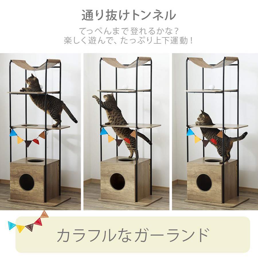 楽しい仕掛けがいっぱい! 嬉しい収納付き!1隠れ家ボックス狭いところが大好きな猫ちゃんにぴったり!トイレや爪とぎを隠すと、お部屋の雰囲気もアップ2ごろごろハンモックのんびり寝転んでまったりリラックス猫ちゃんの愛らしい姿に飼い主さんも癒される3ゆらゆらポンポンふわふわ揺れるポンポン付き!4通り抜けトンネルてっぺんまで登れるかな楽しく遊んで、たっぷり上下運動!