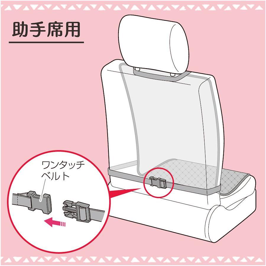 取り付け簡単、ヘッドレストにひっかけるだけで使えるドライブシートです。防水加工を施しているので汚れてもすぐにキレイにふき取れます。水洗いも可能です。助手席用。