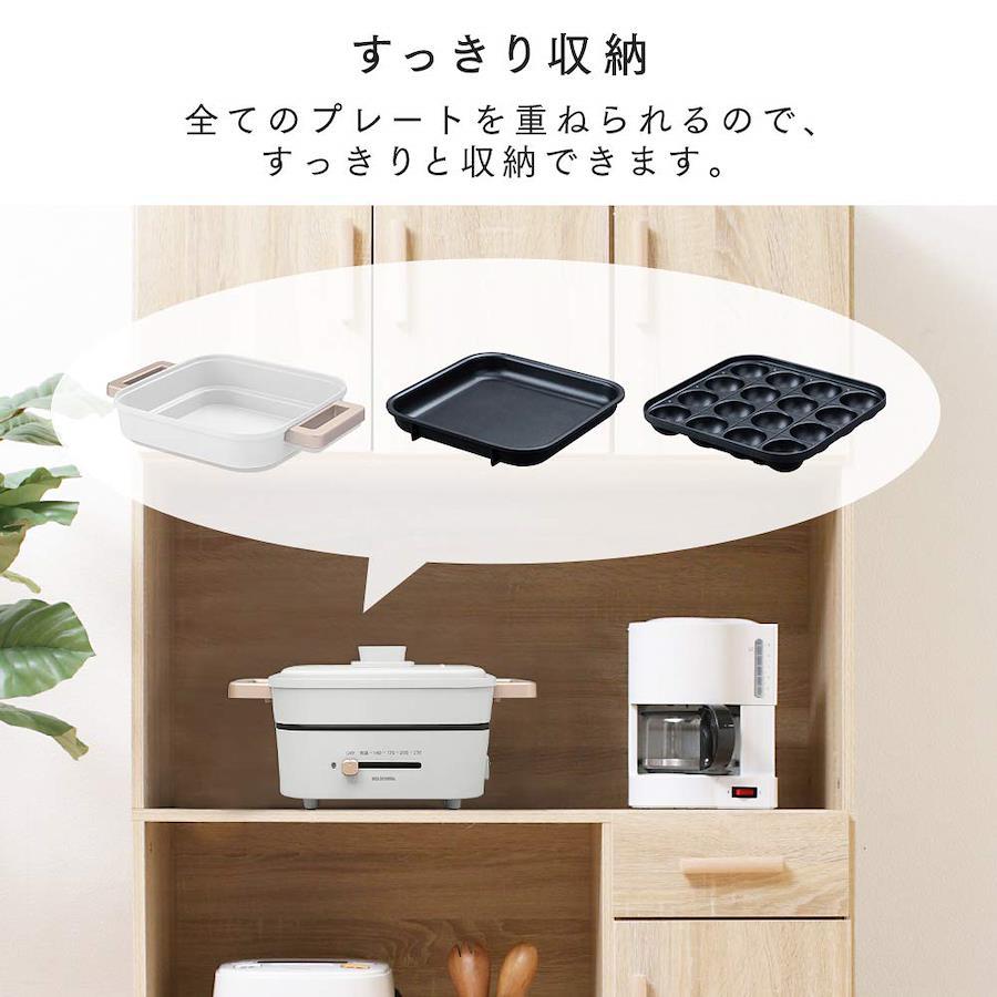 煮る、炊く、焼くがこれ1台。食卓でアツアツ料理が楽しめます。煮物やなべ料理などに便利な深なべ、焼肉やお好み焼きなどが楽しめる平面プレート、たこ焼きプレート付きです。