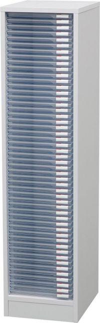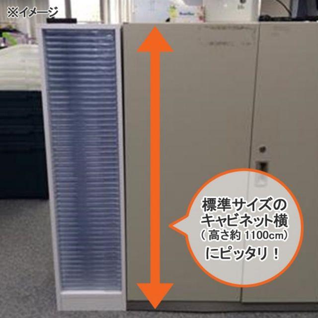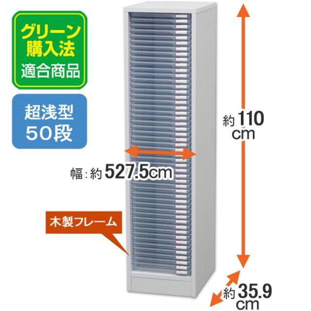オフィスなどのデスク横に最適な高さの木製フロアケースです。木製フレームなので、SOHOオフィスやご家庭のインテリアにも調和します。この他にもデスク下・キャビネット横に最適なサイズも取り揃えております。●商品サイズ(cm):幅約27.5×奥行約35.9×高さ約110●引出内寸(cm):超浅型:幅約23×奥行約32.1×高さ約1.4●重量:約19.8kg●引出し仕様:超浅型50段●耐荷重:超浅型引出し:0.5、全体:25●材質本体:プリント化粧紙パーティクルボード引出:スチロール樹脂●グリーン購入法適合商品