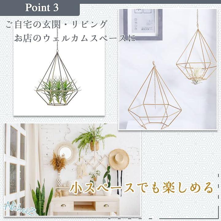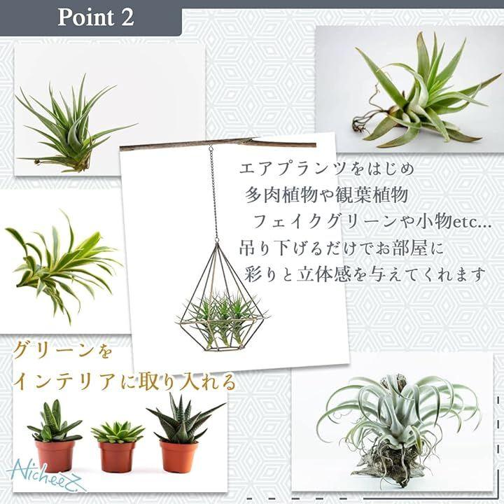 「流行のインテリアグリーンを簡単に」エアプランツをはじめ、多肉植物や観葉植物、フェイクグリーンや小物等を入れて吊り下げるだけでお部屋に立体感と彩りを与えてくれます。