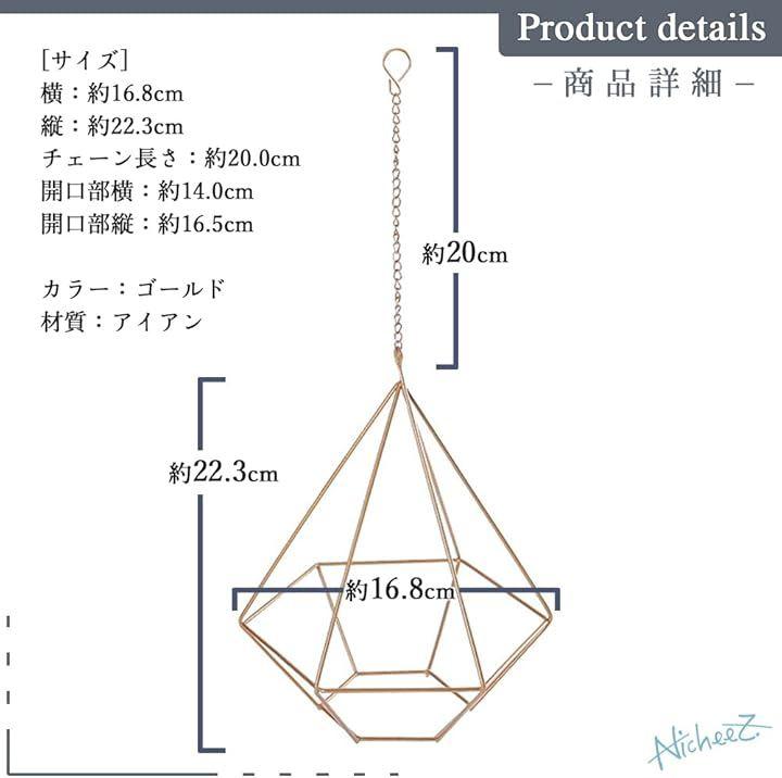 「商品内容」プラントハンガー セット数:1セット 材質:アイアン カラー:ゴールド サイズ:横/約16.8cm 縦/約22.3cm 開口部横/約14cm 開口部縦/約16.5cm チェーン長さ/約20cm