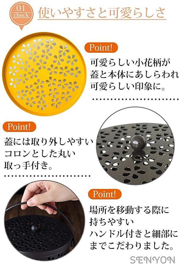 花柄の形をした穴より風通しがよく、可愛らしい丸い取っ手の蓋と3点の足も付いていますので安全性があります。