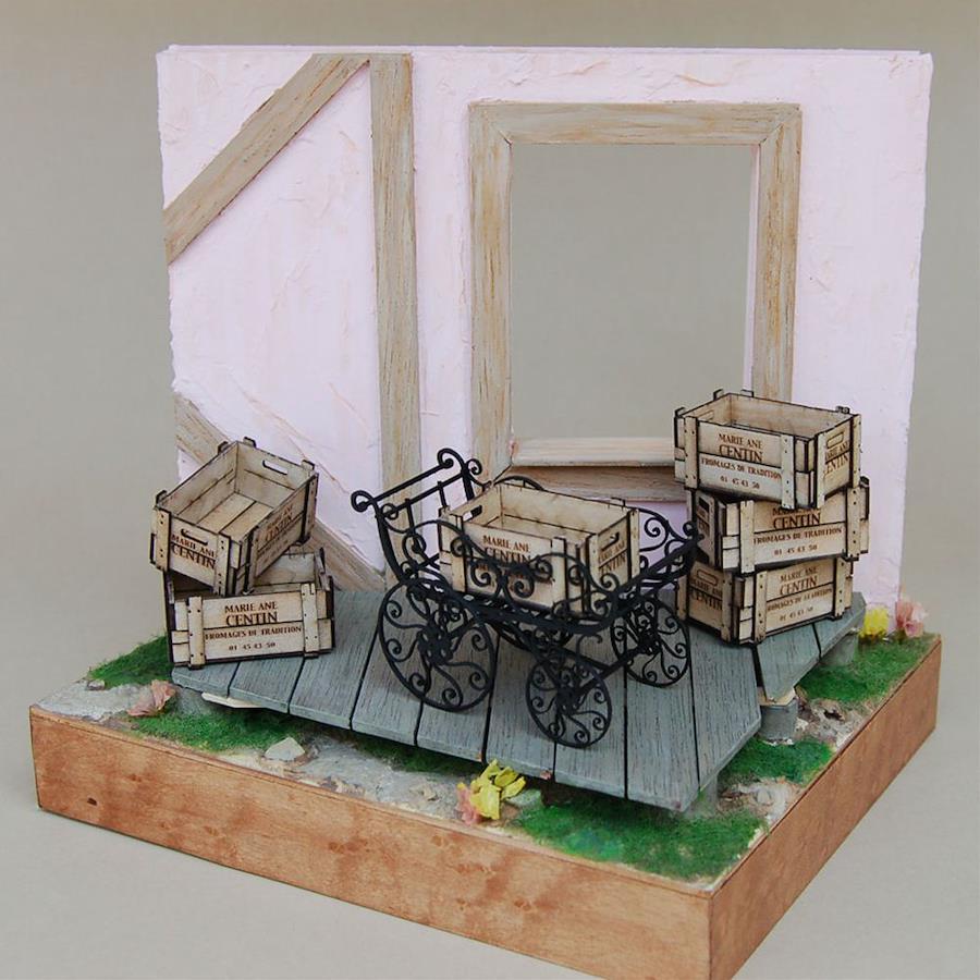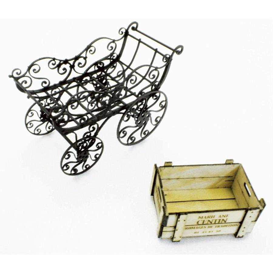 ドールハウスミニチュア ロートアイアンシリーズ素材は上質な紙製。木箱は木材で再現しています。本製品は組み立てキットです。別途にナイフ、木工ボンド、瞬間接着剤、塗料をご用意ください。