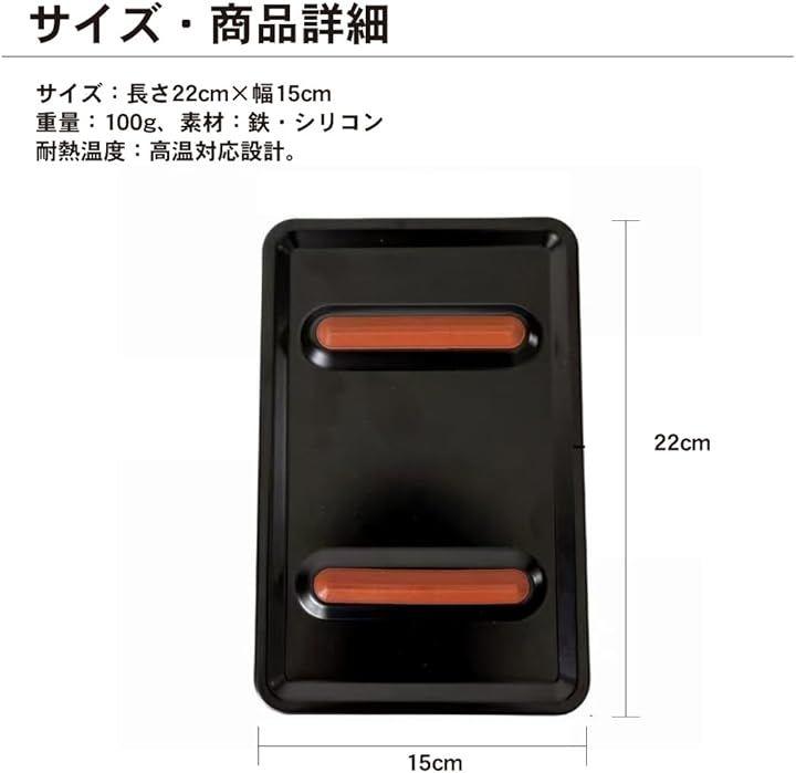 「商品詳細」サイズ:長さ22cmx幅15cm、重量:100g、素材:鉄・シリコン、耐熱温度:高温対応設計。