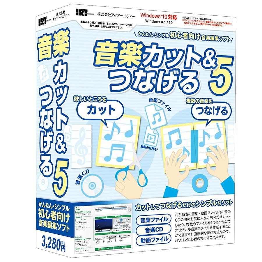 ■Software OverviewMusic Cut & Connect 5 is a soft way to cut and connect music and video files on DVDs/CDs and computers.You can edit music files on your DVD/CDs or computers and create a background with just the parts you want.In addition to storing the music files you created on your computer, you can also store it on your computer.You can carry your iPod, iPod touch, iPhone, iPad, and Android devices with your smartphone and enjoy carrying it around with you.Use the included CD ripping tool and music converter 2 toIt is convenient for you to store CD's music or music extracted from DVD videos on your computer.You can easily edit your favorite music with "Music Cut & Connect 5".■Recommended for: Convenient!Those who want to edit music files easily.For those who want to cut and connect only the parts they want.Those who want to store music on CDs on MP3 or WAVThose who want to extract music from DVDs and video files.■ New FeaturesYou can now add silence for 0.1 to 5 seconds.Improved usability to add directly to your storage list without trimming.Supports .M4A format file reading.Comes with "Music Converter 2" Added reading of M4A/AAC/MOV/FLV files, support WAV/MP3 output.■Main FeaturesCut and connect music and videos.Set the beginning and end of the cutout range while reading music or video files, listening to music, and cut out of range.If you decide where to cut it, double click the file after adding the storage list,You can play the beginning and end (end) ranges,You can change the range of start (start) and end (end), making fine-tuning edits easy.Multiple music can be connected (united) to store or cut pieces individually, depending on your application.You can also play it from 5 seconds before set to the end of the cut-out point.Fade-in and fade-out settingsFade in and fade out settings when saving cut files.You can set fade-in fade-out for each connected file or cut file to connect music naturally.Volume adjustmentYou can adjust the volume of the music to save when you save the cut files.It is small for sound sources that are too large and if the sound source is too small, it is convenient to adjust before storage.Store DVD/CD music on your PC.With the music converter 2 and CD ripping tool,You can easily store the recorded DVD (DVD Video Mode, VOB format) music (voice) and CD music (voice) to your computer.The DVD can be saved by the chapter and then connected to the "Music Cut & Connect 5" (connected).It can be converted to WAV / MP3, so it can be used for iPod, Android smartphones, etc.You can also put it in your device to play and carry your DVD/CD music.The stored music files can be edited in "Music Cut & Connect 5".Transfer music files to iTunes and Android after conversion.Automatically register to iTunes and Android devices when you store music.Music registered to iTunes can be carried with you in your iPod, iPod touch, iPhone, and iPad.Set bit rates and sampling rates to convertWhen storing music, you can set the bitrate (data transmission speed) and sampling rate (CD/PC frequency).■Operating environmentCompatible operating systems: Windows 8.1 / 10.Not compatible with Mac OS.We do not guarantee the operation on the OS that has been terminated with Microsoft support period. Also, our support is not included.CPU: Intel processor 2 GHz or higher (or equal or higher compatible processor).Memory: Over 2 GBDisplay: Environments that support 32-bit of color depth in a resolution of 1,280 x 1,024 or higher than true color.The screen resolution is less than 1,280 x 1,024 and the 5" screen will not be displayed normally, depending on the screen letter size settings.CD-ROM: Over double speed.Hard disk: 1 GB or more free capacity (when installed).Other than that, there is a free capacity to store data on the system drive.Others: An internet connection environment is required.An internet connection environment is required when browsing the online manual or updating this product.The latest iTunes version requires an environment to operate properly.When transferring to an Android device, please prepare a transmission environment.Supported File Formats:(Music Cut & Connectable 5)Read format: MPEG1 / M4A / WMV / AVI / MP3 / WAV / WMAStorage format: MP3 / M4A / WAV / WMA / 3GPP / 3GPP2Reading: WAV/MP3/M4A/AAC/WMA/MPEG/MOV/MP4/FLV/AVI/WMV/VOB (DVD video mode).Output: WAV/MP3Readable CDs: CDs without copy protectionStorage format: MP3 / WAVFor details, please check the manufacturer's product page. Soft to cut and connect music and video files on DVD/CDs and computers You can edit music files on your DVD/CDs or computers and create a background with just the parts you want In addition to storing the music files you created on your computer, you can also carry them with you on your iPod, iPod touch, iPhone, iPad, and Android devices With the included CD Rip Tool and Music Converter 2, you can conveniently store CD's music or music extracted from DVD videos on your computer Compatible operating systems: Windows 8.1 / 10. *Does not support Mac OS