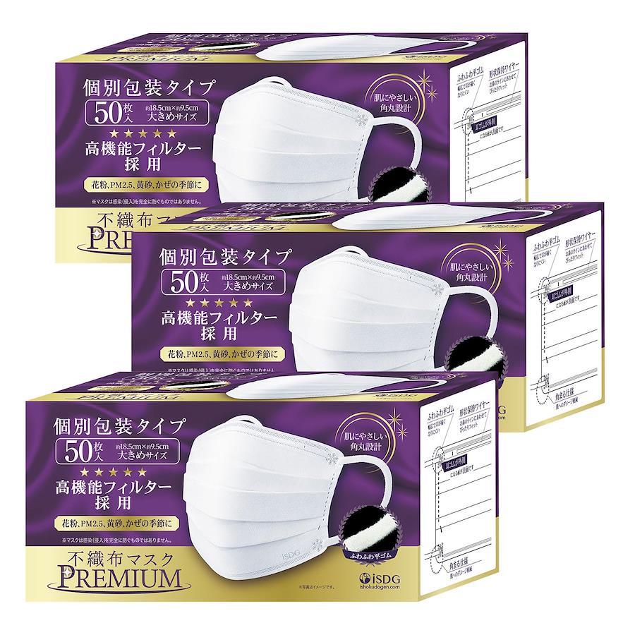 お客様の多数のご要望をいただき、『不織布マスクPREMIUM』に大きめサイズが登場! ゆったり使いたい方や耳ゴムが食い込んで痛いという経験がある方など、幅広くお使いいただけるサイズになっています。