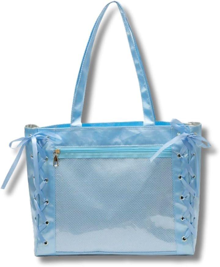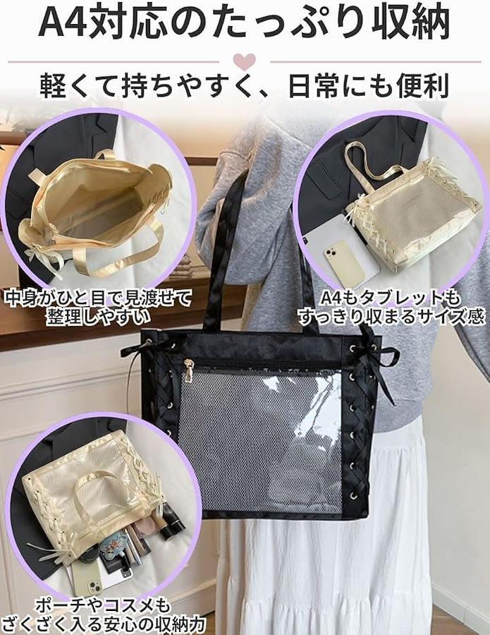 「華やかなリボンデザインで魅せるトートバッグ」サイドにあしらわれたレースアップのリボンが印象的な、女性らしいトートタイプの痛バッグです。