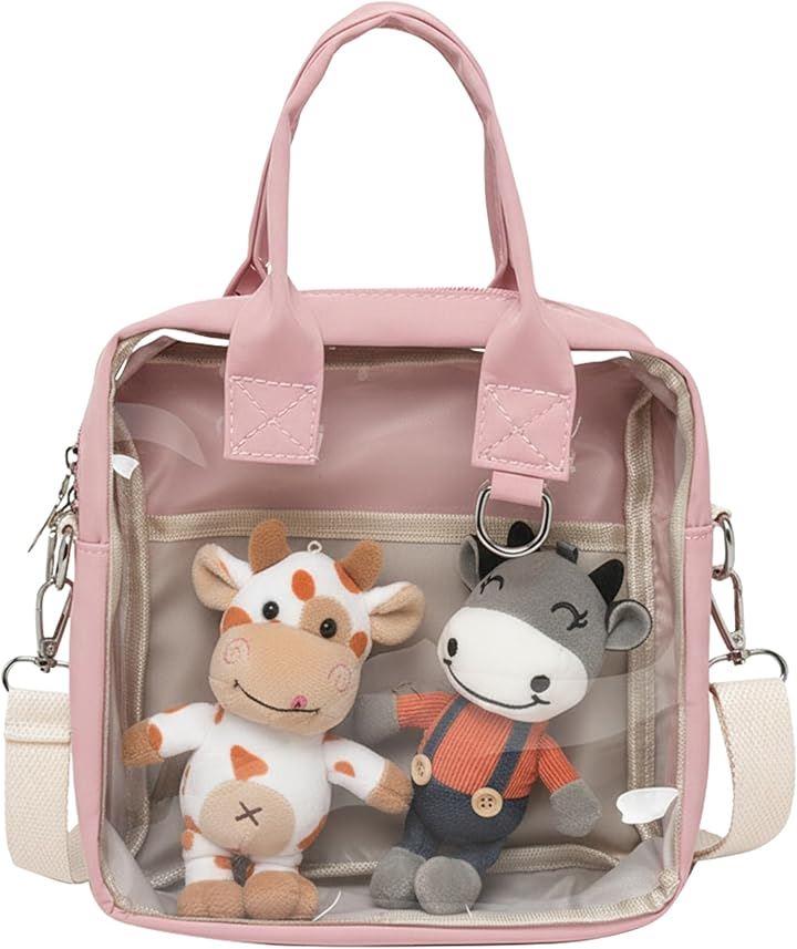 透明窓つきの表面は、約20x20cmの広いクリア窓なので、中身がよく見え、お気に入りのぬいや缶バッジを可愛く飾れる“見せるバッグ”。