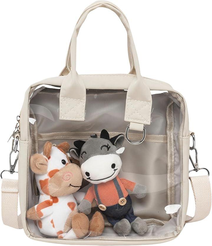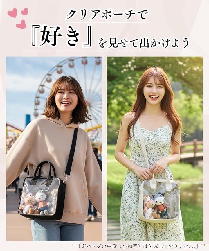 透明窓つきの表面は、約20x20cmの広いクリア窓なので、中身がよく見え、お気に入りのぬいや缶バッジを可愛く飾れる“見せるバッグ”。