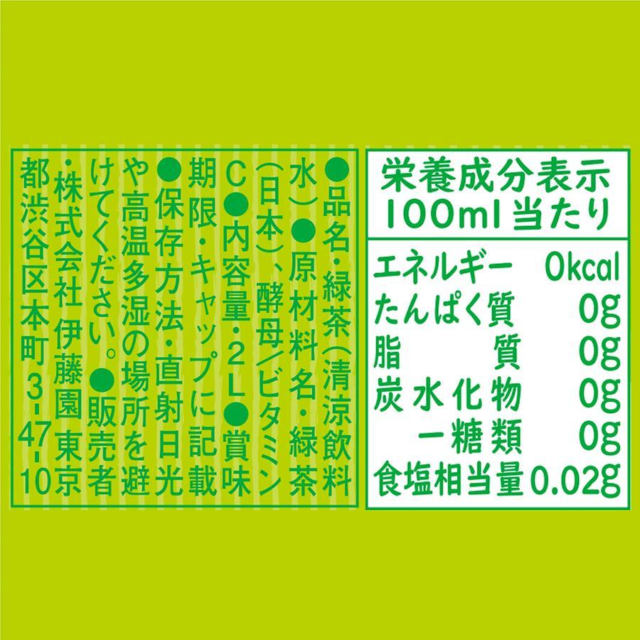 内容量:2L×8本容器:ペットボトル原材料:緑茶(日本)、酵母/ビタミンC栄養成分(100ml当たり):エネルギー:0kcal、たんぱく質:0g、脂質:0g、炭水化物:0g(糖類:0g)、食塩相当量:0.02gアレルゲン:無し【免責事項】メーカーによる商品リニューアルに伴いパッケージ(内容量も含む)変更が行われた場合、新パッケージでお届け致します事ご了承願います。