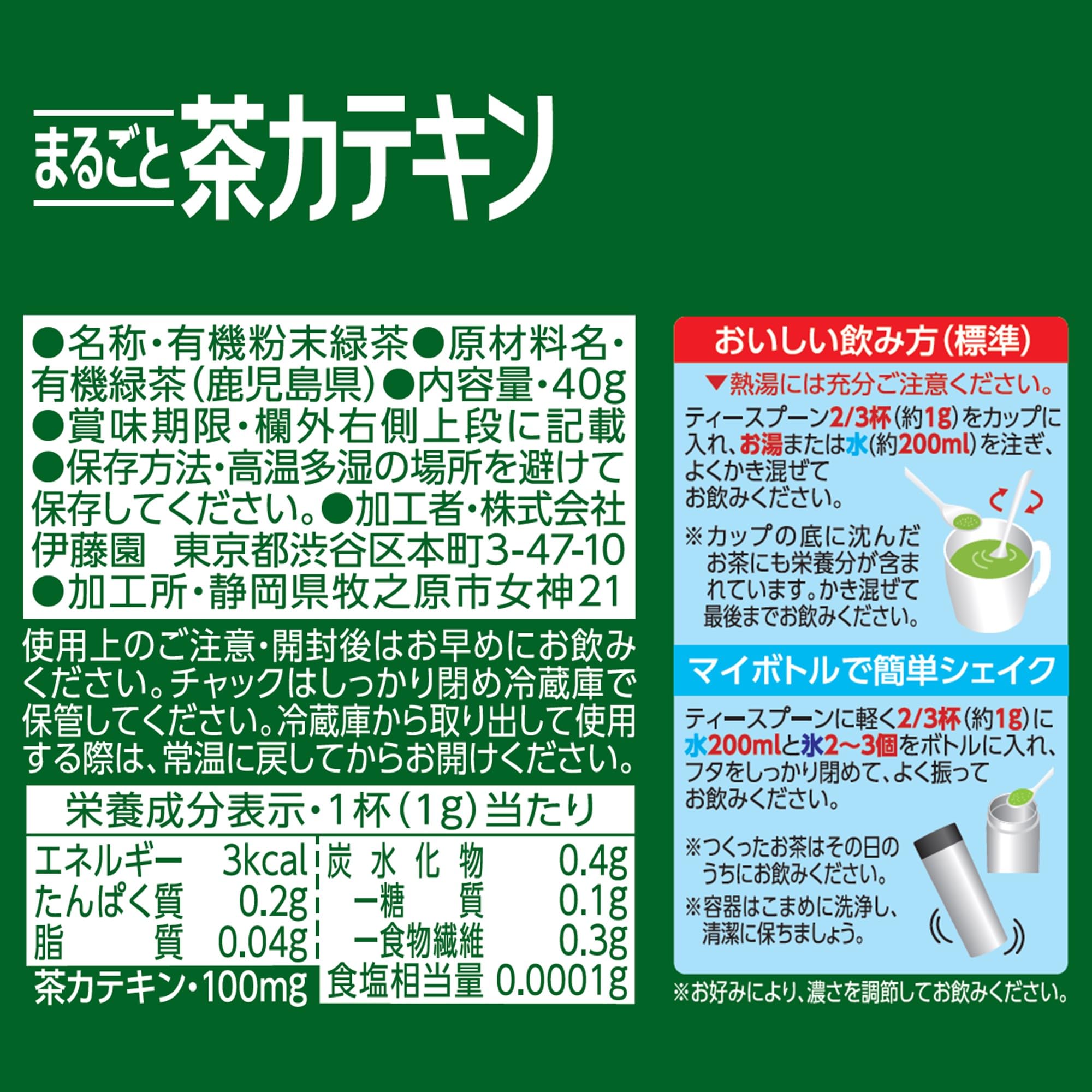 ●まろやかな味わいの粉末緑茶(有機緑茶粉末)。●鹿児島県産、生産者限定した有機緑茶をまるごと粉砕。成分もまるごと摂れます。●有機JAS認証の茶葉を使用。マグカップ1杯で茶カテキン100mg。1袋でたっぷりマグカップ約40杯。(*マグカップ1杯当たり=1g/200ml換算)●お湯や水にも溶けやすく茶殻などゴミもでない。保存に便利なチャック付きスタンドパック。●ヨーグルトにふりかけたり、食べてもおいしい。商品裏面にまるごと食べるお料理レシピつき。