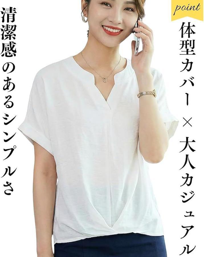 フロントのタックがお腹周りを隠し、自然な体型カバーを叶えるトップスです。