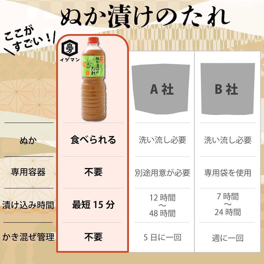 3営業日以内に発送≪新品未開封品≫焙煎米ぬか(国産)をベースに、本醸造しょうゆ、かつおぶしエキス等で調味したぬか漬け用調味料です。たれの量で味の調整が容易にできるよう、粘度を控えたペットボトル入りの商品設計になっています。素材の重量の約20%量のたれで漬け込んでください。食べて安心の米ぬかを使用していますので、ぬか漬けの他にも、ディップ等、食べるぬか調味料としてお使いいただけます。賞味期限:10ヶ月■保存方法:常温(開封後要冷蔵)【重要】メーカーによる商品リニューアルに伴いパッケージ(内容量も含む)変更が行われた場合、新パッケージでお届け致します事ご了承願います。