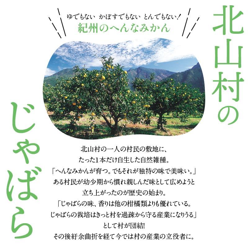 北山村にだけ自生する幻の果実 じゃばらって?『じゃばら』は昔から北山村に自生していた自然雑種で、 ここでしか栽培されていないため「幻の果実」と呼ばれています。「香酸柑橘」で、独特の風味がある大変珍しい柑橘です。