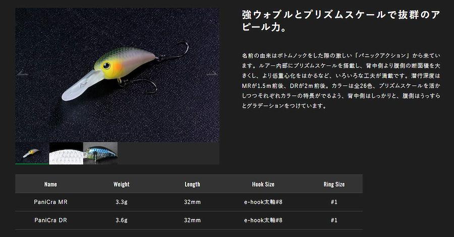 名前の由来はボトムノックをした際の激しい「パニックアクション」から来ています。ルアー内部にプリズムスケールを搭載し、背中側より腹側の断面積を大きくし、より低重心化をはかるなど、いろいろな工夫が満載です。潜行深度はMRが1.5m前後、DRが2m前後。カラーは全26色、プリズムスケールを活かしつつそれぞれカラーの特長がでるよう、背中側はしっかりと、腹側はうっすらとグラデーションをつけています。