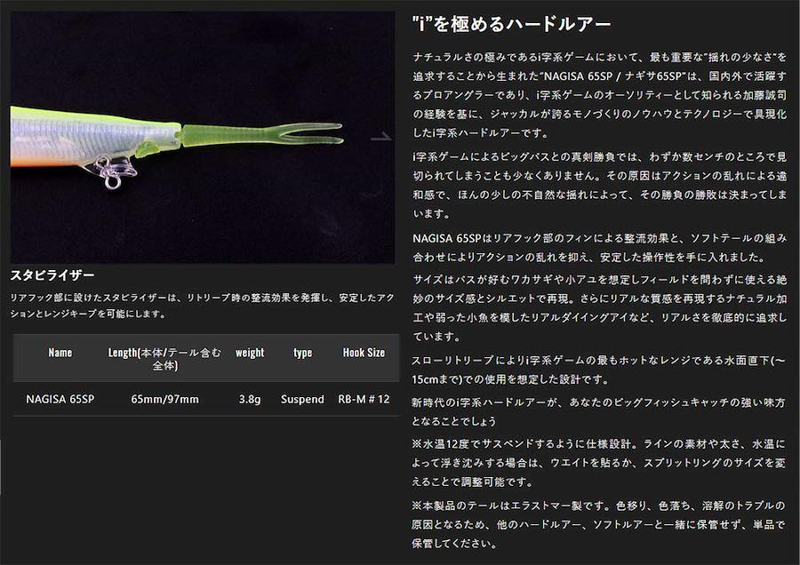 ナチュラルさの極みであるi字系ゲームにおいて、最も重要な"揺れの少なさ“を追求することから生まれた"NAGISA 65SP / ナギサ65SP"は、国内外で活躍するプロアングラーであり、i字系ゲームのオーソリティーとして知られる加藤誠司の経験を基に、ジャッカルが誇るモノづくりのノウハウとテクノロジーで具現化したi字系ハードルアーです。NAGISA 65SPはリアフック部のフィンによる整流効果と、ソフトテールの組み合わせによりアクションの乱れを抑え、安定した操作性を手に入れました。サイズはバスが好むワカサギや小アユを想定しフィールドを問わずに使える絶妙のサイズ感とシルエットで再現。さらにリアルな質感を再現するナチュラルフィッシュ加工や弱った小魚を模したリアルダイイングアイなど、リアルさを徹底的に追求しています。スローリトリーブによりi字系ゲームの最もホットなレンジである水面直下(~15cmまで)での使用を想定した設計です。新時代のi字系ハードルアーが、あなたのビッグフィッシュキャッチの強い味方となることでしょう! ※水温12度でサスペンドするように仕様設計。ラインの素材や太さ、水温によっ