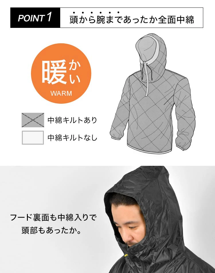 【_暖キルトヤッケ】全面に中綿が入った暖かいヤッケです。高周波圧着加工がおどこされており、使い続けていると縫い目から綿が出てくるなどの心配がなく長くお使い頂けます。