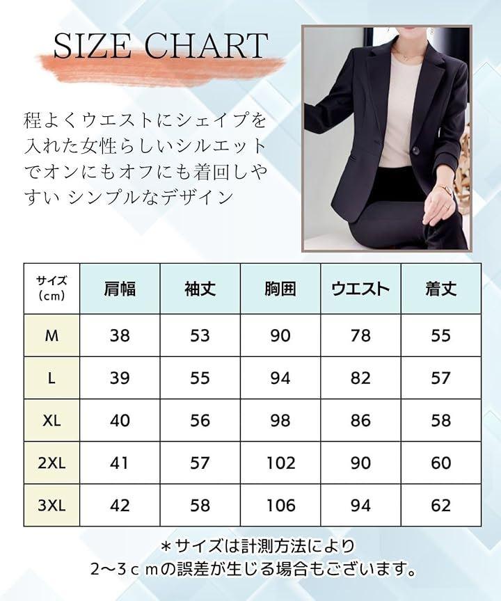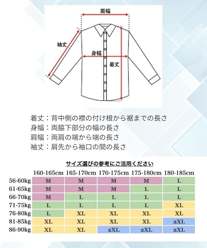 「M」肩幅38/袖丈53/バスト90/ウエスト78/丈55 「L」肩幅39/袖丈55/バスト94/ウエスト82/丈57「XL」肩幅40/袖丈56/バスト98/ウエスト86/丈58「2XL」肩幅41/袖丈57/バスト102/ウエスト90/丈60「3XL」肩幅42/袖丈58/バスト106/ウエスト94/丈62