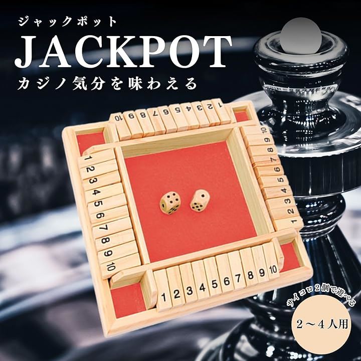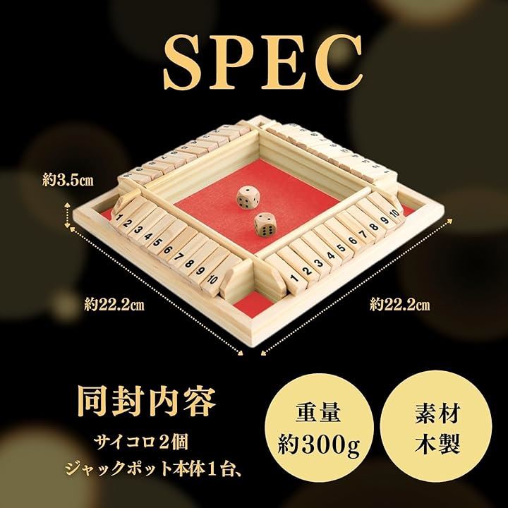 「仕様」*内容:ジャックポット本体1台、サイコロ2個、*素材:木製 *サイズ:約22.2x22.2x3.5cm *重さ約300g